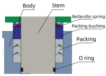 7. Sistema di tripla tenuta meccanica dello stelo: in primo luogo, sullo stelo è presente un O-ring che fornisce la prima tenuta. In secondo luogo, utilizziamo la baderna di tipo "V" attorno allo stelo. La baderna a forma di "v" subisce un cambiamento di forma quando viene esercitata pressione dal tappo, consentendole di fornire una tenuta secondaria. In terzo luogo, aggiungiamo una molla Belleville sopra la boccola premistoppa. Quando la guarnizione si deforma sotto l'alta pressione, può impedire la perdita a bassa pressione.