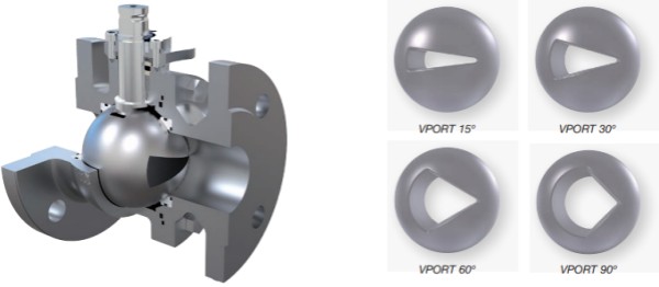 Una valvola a sfera con porta a V può anche essere definita valvola a sfera con tacca a V , perché la sfera all'interno della cavità della valvola ha una porta a forma di "V". La valvola a sfera V-port è una valvola di controllo ad alte prestazioni con multi-funzioni, poiché combina la funzione di taglio di una valvola a ghigliottina, la precisa funzione di controllo di una valvola a globo e le eccellenti prestazioni di tenuta di una valvola a sfera tradizionale. La struttura V-port è progettata principalmente per applicazioni di limitazione e commutazione.